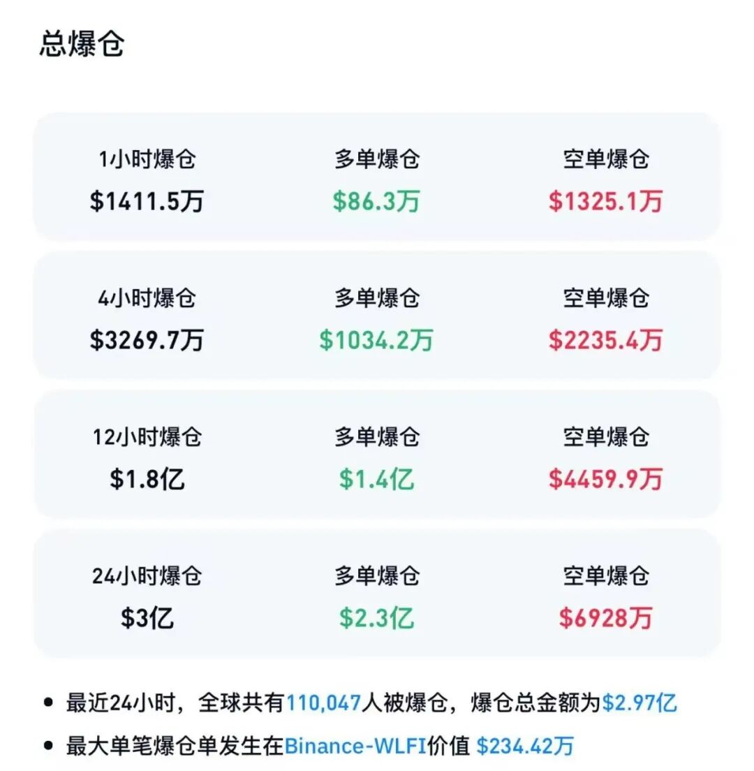 截至发稿,根据CoinGlass数据,最近24小时,全球超过11万人爆仓,爆仓总金额为2.97亿美元。