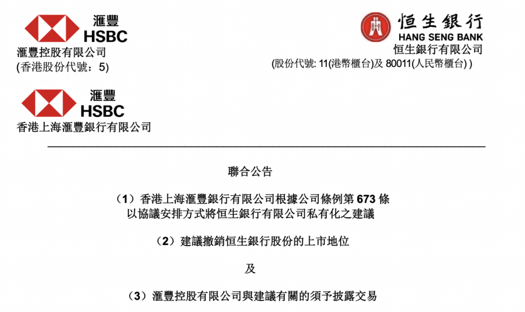 10月9日,汇丰控股宣布,与其全资附属公司香港上海汇丰银行有限公司(下称“汇丰亚太”)提出一项附先决条件的建议,拟透过协议安排的方式将恒生银行私有化。当日,恒生银行也发布了联合公告确认此事。